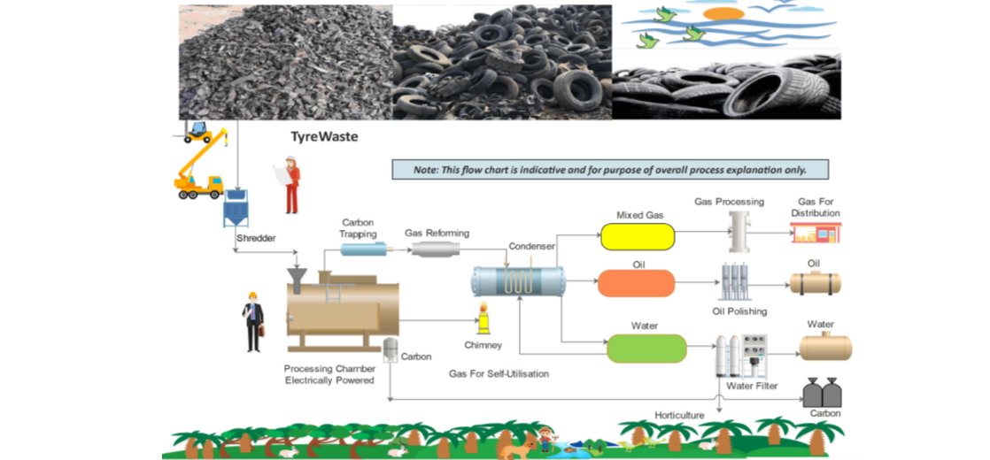 - Can reform any Hydrocarbon waste (rubber, plastic, municipal waste, organic waste & sludge waste) into Light Diesel Oil (LDO), Gases, Green Hydrogen, Electricity, Carbon & Water.
